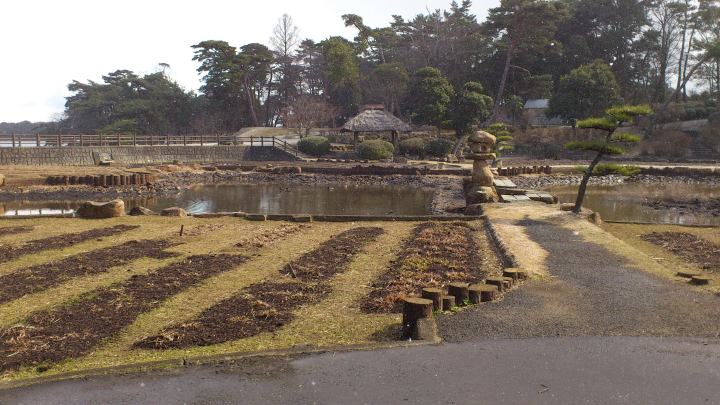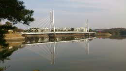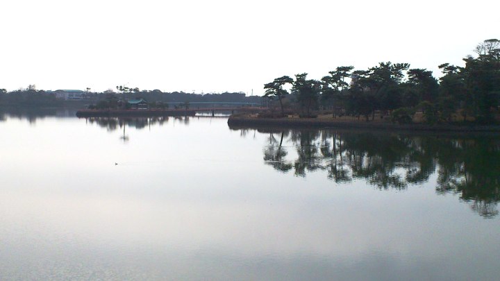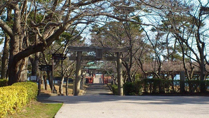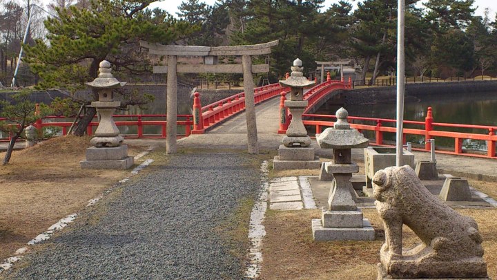 岸から50mほど離れた場所にぽっこり浮かぶ人工島。 神社が祀られ、岸からは橋で繋がれていてお参りができる。