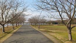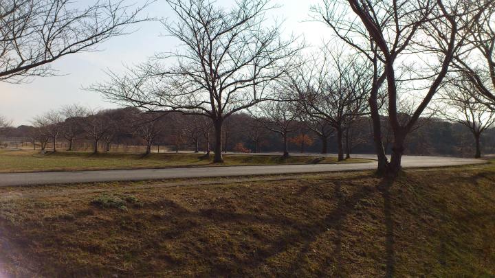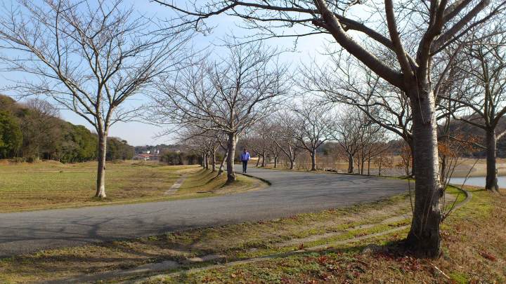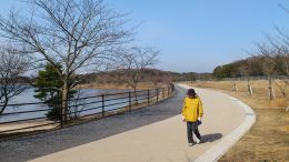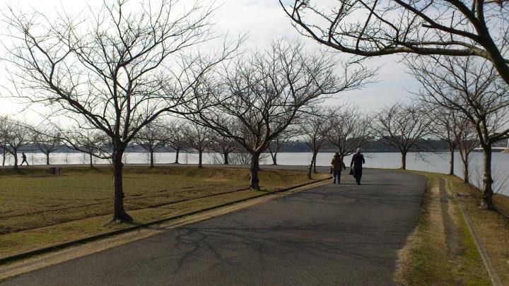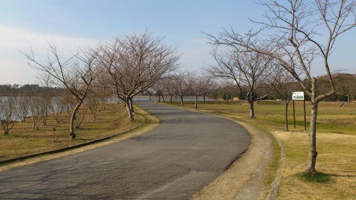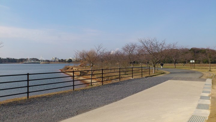 『ときわ湖畔遊歩道』の中でも、特に特徴のあるエリアに差しかかった。 湖面につんと突き出た半島のような地形に沿って道が舗装されている。 まるでUターンをするかのように、小さな内径でくるりと円を描く。 最初見たときからどことなくムードのある風景に思えて、以来僕の中では最も魅力的な場所。 ここでも道の両側は桜の木が植えられていて、シーズンともなると一層磨きのかかった風景に変わることだろう。